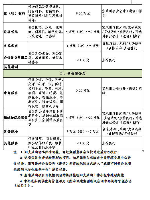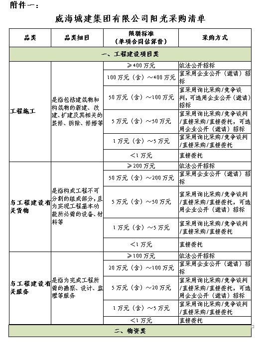第十七條 本制度規(guī)定的采購范圍包括工程建設(shè)項目、物資和社會服務(wù)的招標(biāo)采購(詳見附件一《威海城建集團(tuán)有限公司陽光采購清單》)。