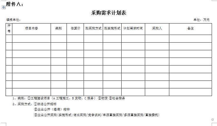 1.年度采購需求計劃表:需求部門(單位)應(yīng)在本年度12月10日前根據(jù)下一年度的工作任務(wù)和工作目標(biāo),編制并提報下一年度的《年度采購需求計劃表》;