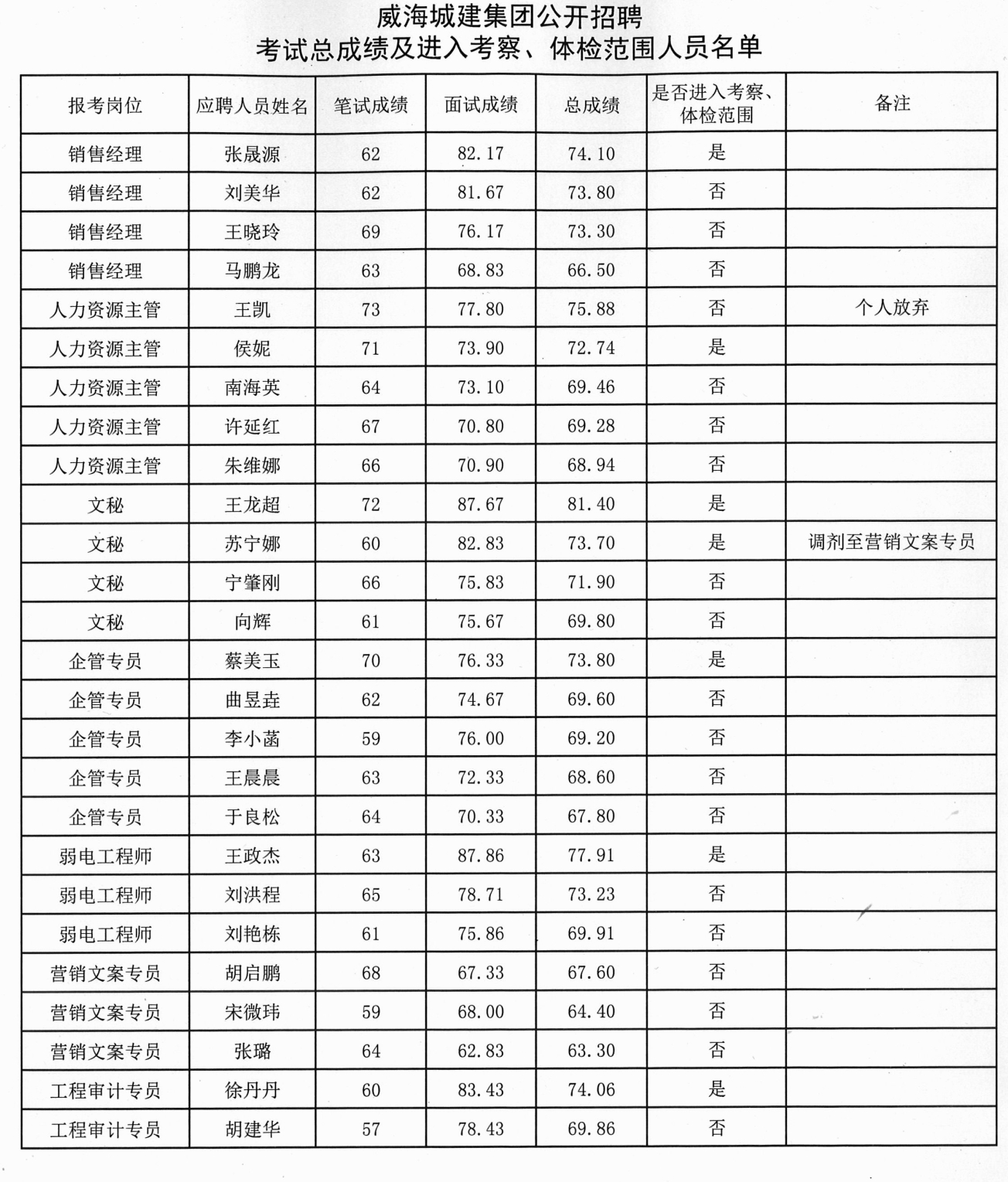 威海城建集團(tuán)公開招聘考試總成績(jī)及進(jìn)入考察、體檢范圍人員名單