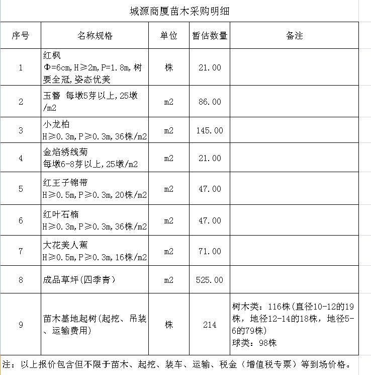 (4)采購內(nèi)容:城源商廈項(xiàng)目綠化苗木的采購及苗木基地樹苗的起挖、裝車并運(yùn)輸?shù)焦さ刂付ǖ攸c(diǎn),采購清單詳見附件。