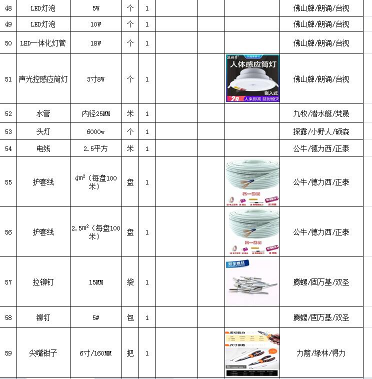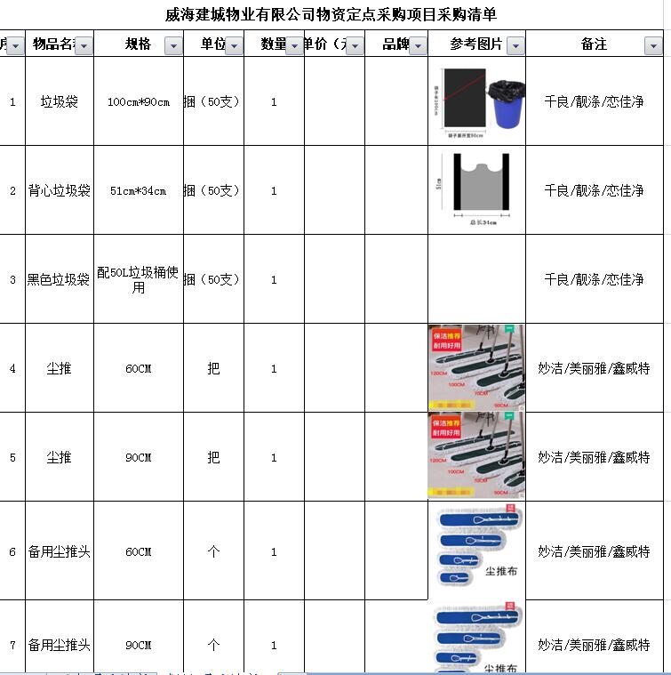 (5)采購內(nèi)容:威海建城物業(yè)物資定點(diǎn)采購,主要包括五金、水暖管件、保潔、維修、綠化所需物資、應(yīng)急維修的其他物資等,采購清單詳見附件。